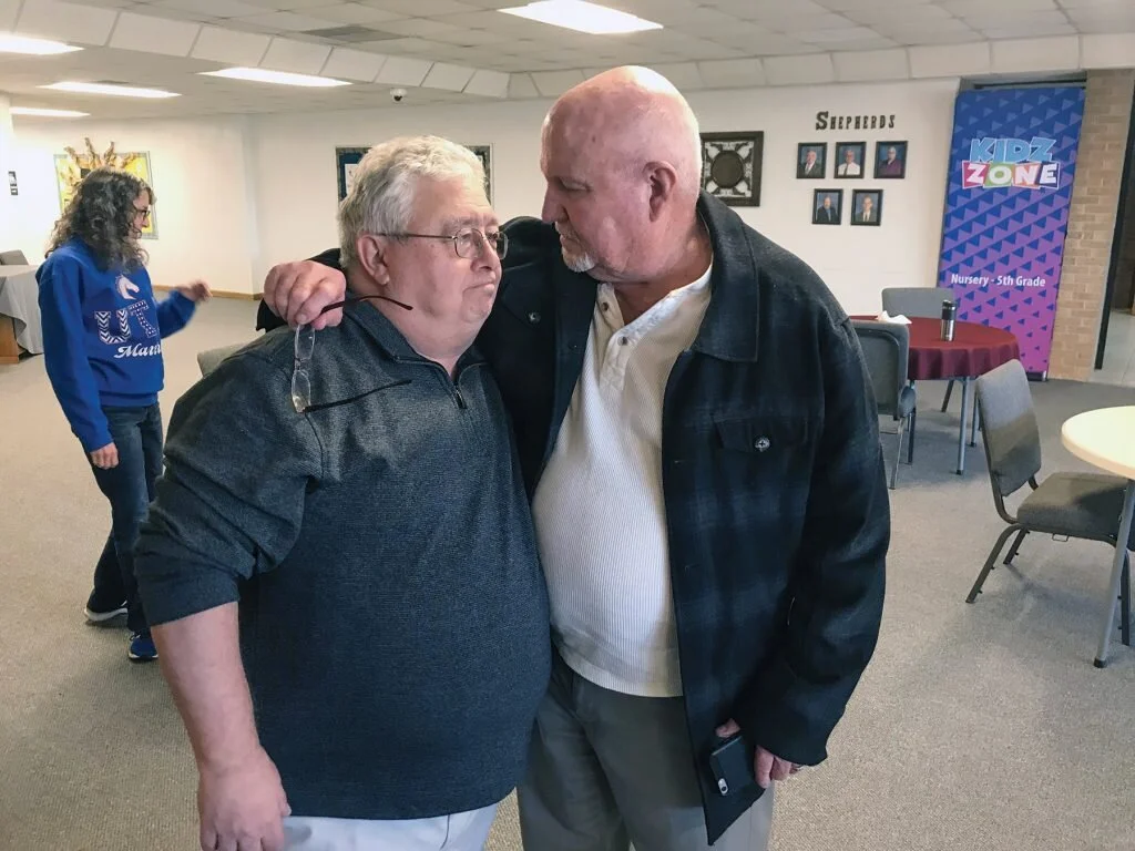 Minister Britt Farmer, left, receives encouragement from church member Hugh Galyean on Monday. Photo by Bobby Ross Jr.