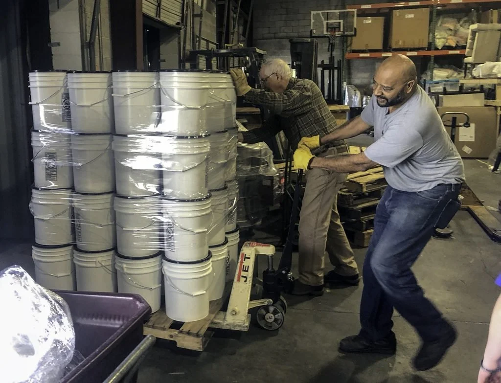 Jerry Blythe loads buckets of relief goods onto a truck at Healing Hands International’s warehouse in Nashville. Photo by Alan Phillips