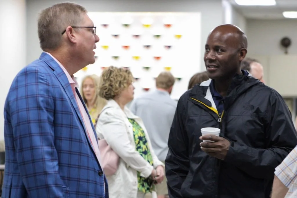 Tulsa Police Chief Wendell Franklin, right, visits with Stacy Kymes, a fellow member of The Park Church of Christ, after worship Sunday. Photo by Gabriel Grant Huff