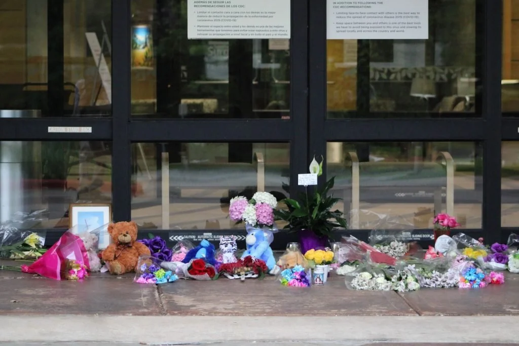 Flowers and items such as teddy tears form a makeshift memorial outside the Natalie Building on the Saint Francis Health System campus in Tulsa, Oklahoma. The building was the site of a mass shooting that claimed four lives, plus the gunman, last week. Photo by Gabriel Grant Huff