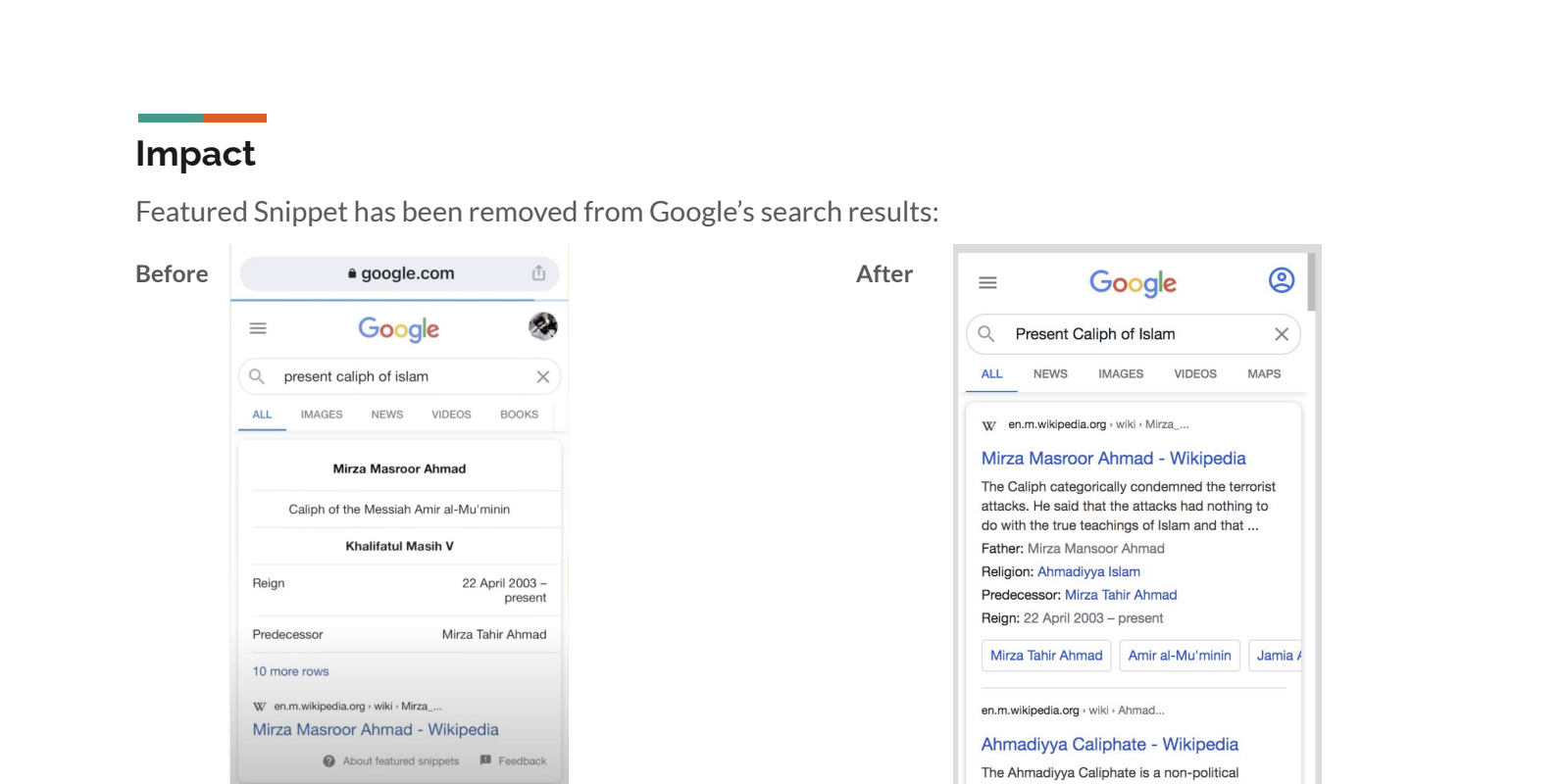 While the removal of both apps only affected Pakistan’s Play Store, Khan says that Google’s search results previously would generate a featured snippet that would list Mirza Masroor Ahmad as the current caliph of Islam when searching for the “the present caliph of Islam.” It appears that Google acquiesced to the PTA by removing the snippet also, and not just for Pakistan but on a greater transnational scale according to screenshots provided by Khan that were taken of the search results in the U.S.