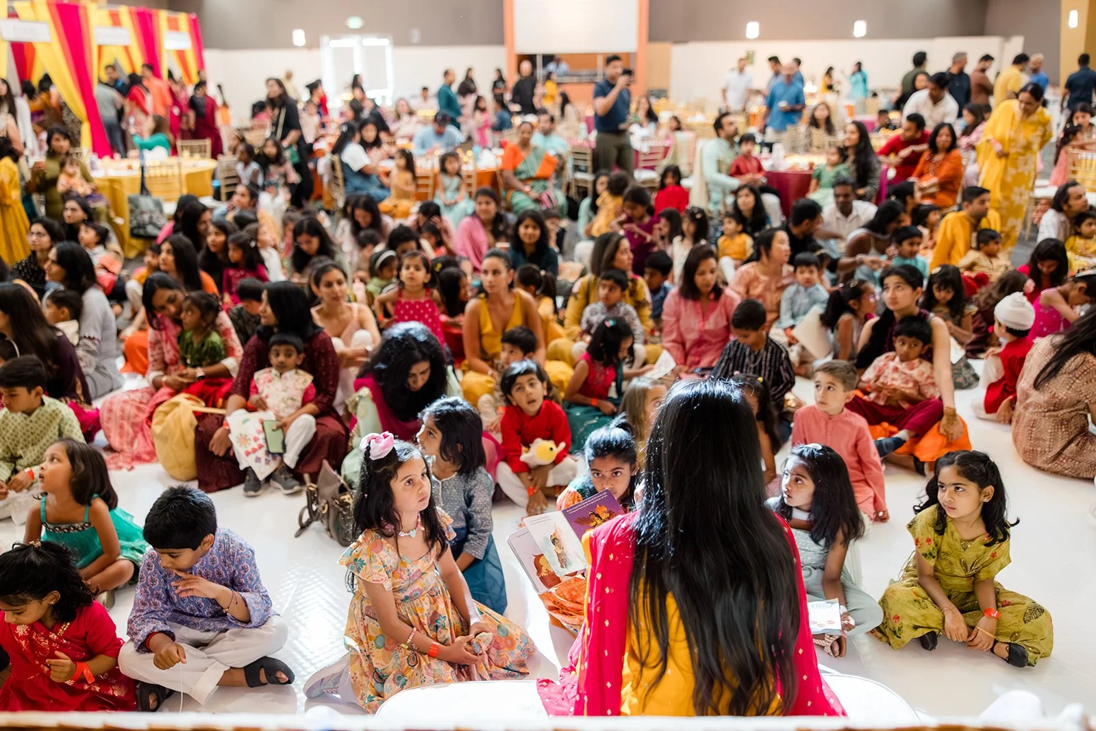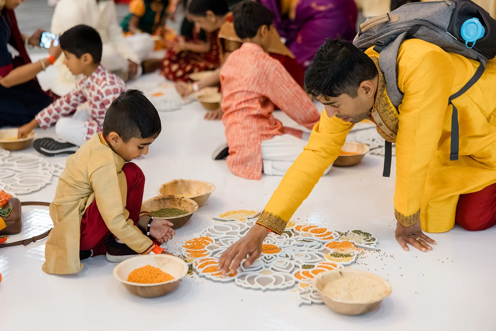 Families design rangoli at a Diwali event. (Photo courtesy of Modi Toys)