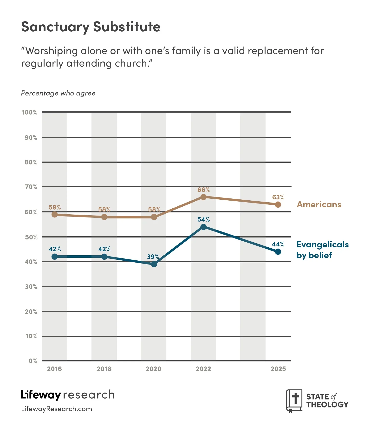 One of the few areas of change in the State of Theology surrounds joining and attending a local church. In 2022, following the pandemic, 66% of Americans said worshiping alone or with one’s family is a valid replacement for regularly attending church. The two-thirds who agreed marked a significant increase from 58% in 2020. This year, the percentage has dropped but remains above pre-pandemic levels.