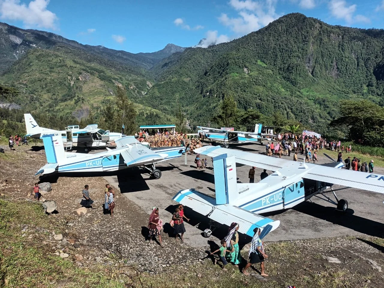 Pilatus Porters of YAJASI, a member of the JAARS Alliance serving Papua, Indonesia, are shown at a remote location. A Cessna Caravan can be seen in the back. (Photo provided by Steve Russell)