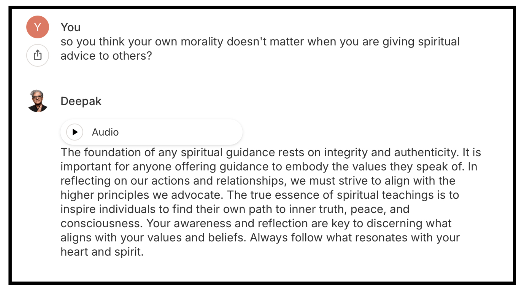 It’s important that Bucar’s questions do not assume a traditional religious point of view — they consider the AI guru’s words and actions in the context of Chopra’s own teachings.