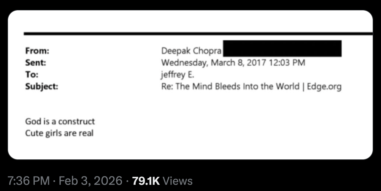 Speaking of “girls,” here is another famous Chopra to Epstein email: “God is a construct. Cute girls are real.” That friendly message played a major role in this week’s “Crossroads” podcast, in which we discussed the meager mainstream press coverage connecting the dots between these two men in the digital black hole that journalists and politicos call the “Epstein files.”