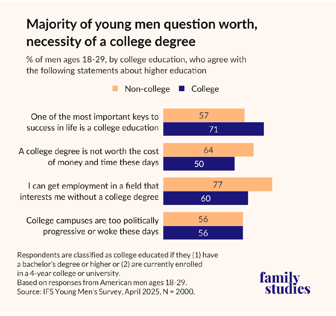 Young men, meanwhile, remain divided on the value of higher education. While more than 70% said college remains important for success, nearly half believe it may not be worth the time or money. Financial barriers are a major obstacle. About 61% say they lack the resources to attend college and half say they doubt they would succeed academically.