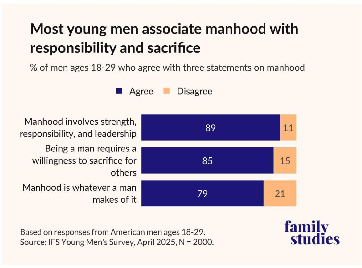 Yet most young men still associate masculinity with positive qualities. Nearly 90% responded that being a man involves sacrifice and 85% link manhood to strength and responsibility.