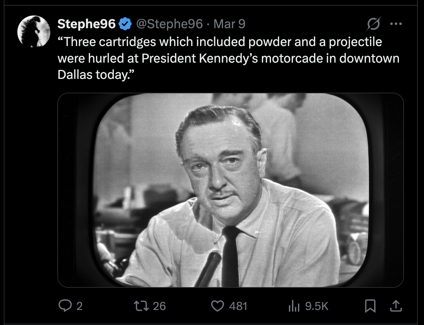 One offered a snarky take on a photo of a serious Walter Cronkite anchoring the CBS News coverage of one of the most important moments in American history. That acidic caption: “Three cartridges which included powder and a projectile were hurled at President Kennedy’s motorcade in downtown Dallas today.”