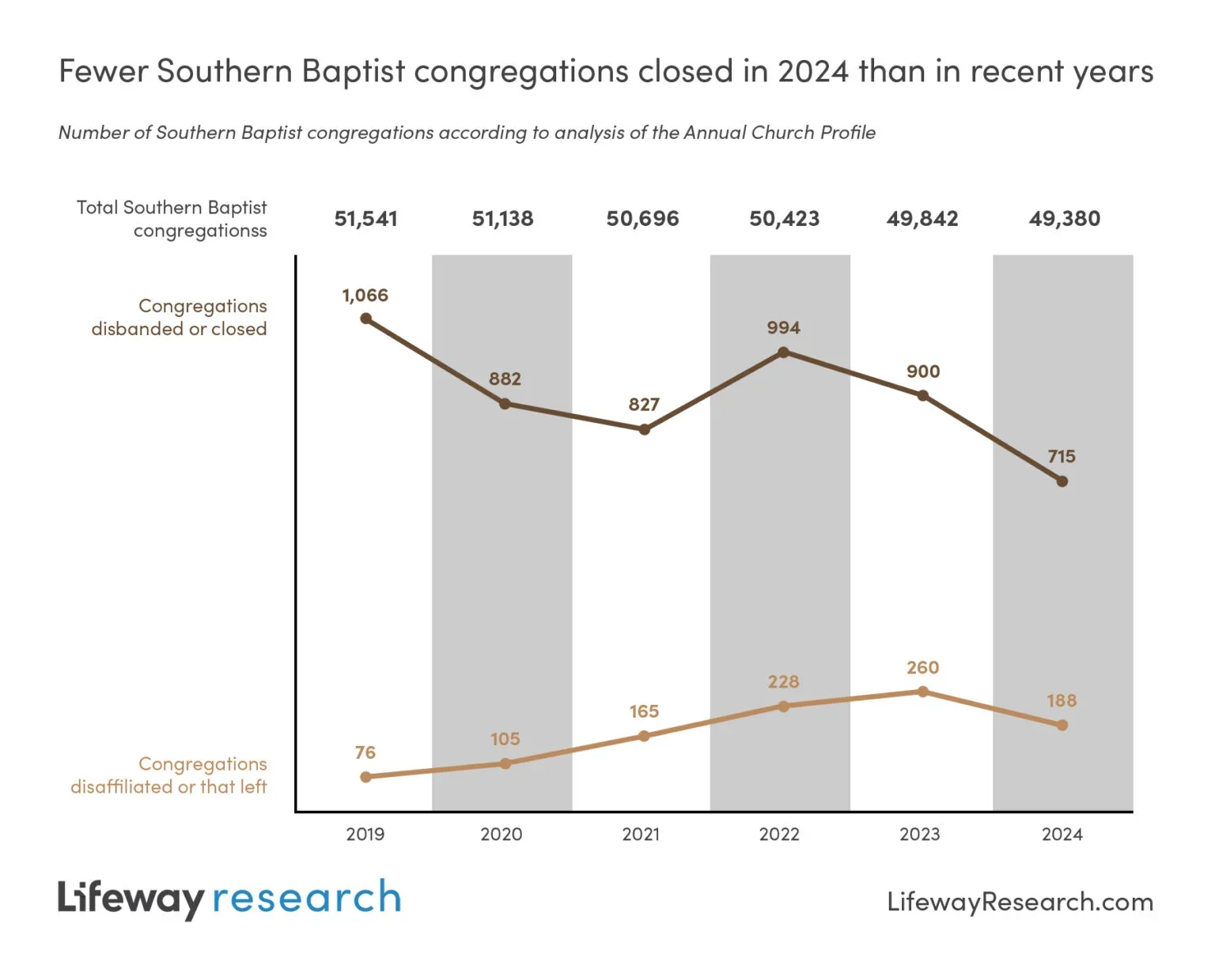 In 2024, 906 of the 49,380 active Southern Baptist congregations from the previous year were no longer part of the convention, including 715 that disbanded or closed and 188 that left or were disaffiliated. However, many new churches were planted, and some existing churches became affiliated with the SBC. So, the Southern Baptist Convention had just 183 fewer congregations in 2024 compared to 2023, according to the SBC’s most recent Annual Church Profile.