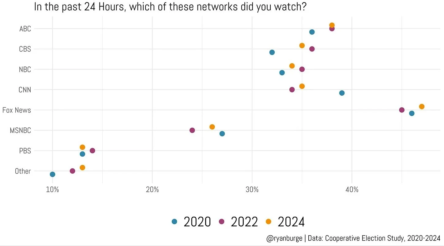 What prompted that little discourse about my media consumption habits is a series of questions that the Cooperative Election Study began asking in 2020 about television network news.