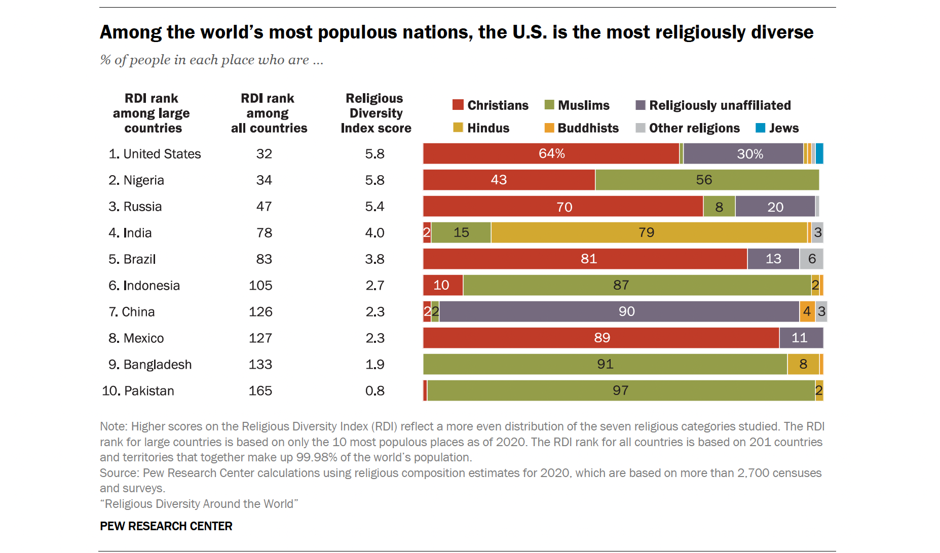 The United States, however, may be a nation of immigrants, but it does not rank among the world’s 10 most religiously diverse countries overall. Pew said the data places the United States 32nd with an RDI score of 5.8.