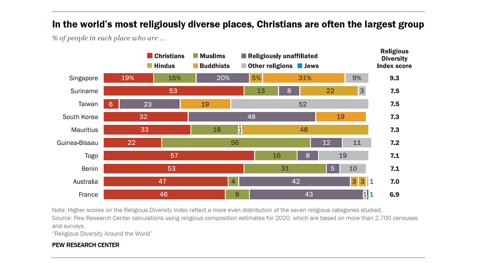 Only 49 countries, Pew said, have three or more religious groups that each make up at least 5% of the population, and just seven — including Singapore and Suriname — have four or more religious groups at that level.