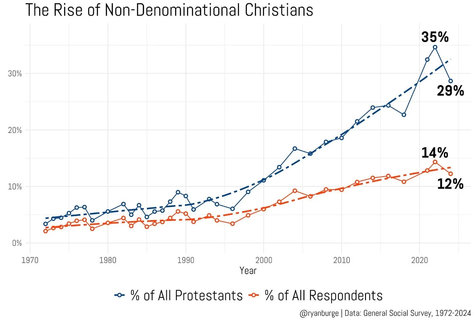 For followers of this newsletter, you’ve seen this graph before — but without the 2024 data included. The share of all Protestants who were non-denominational was just 5% in 1972. It was little more than a rounding error in the grand sweep of Protestantism.