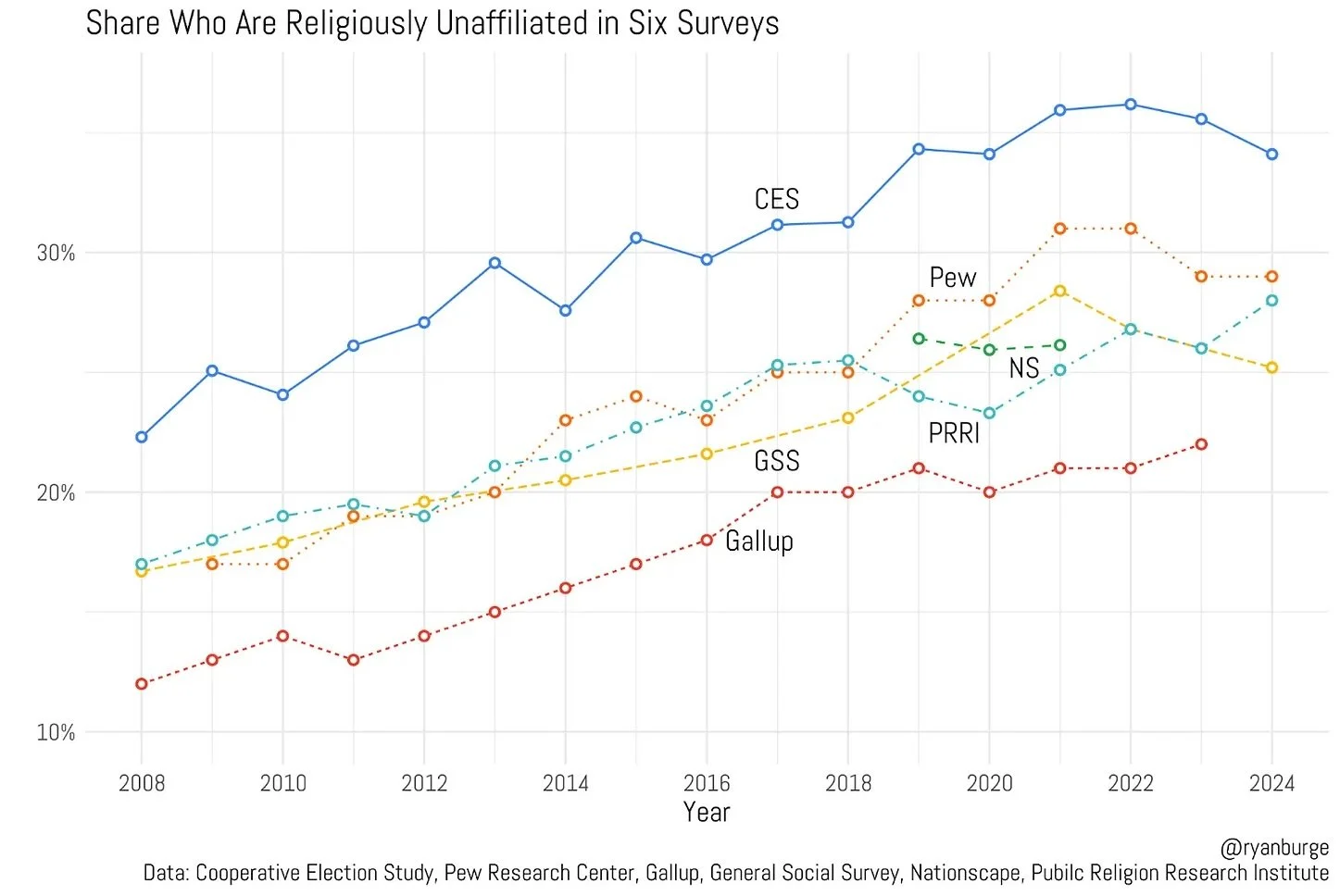 But I’m going to give you that figure across six different surveys that I can find strewn all over the internet. They include the Cooperative Election Study, the Pew Research Center, the Nationscape Survey, the Public Religion Research Institute survey, the General Social Survey and the Gallup Survey.